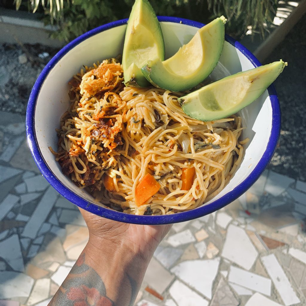 Bien souvent en Haïti, les pâtes sont cuites directement avec la préparation de hareng et de légumes en y ajoutant un volume d’eau jusqu’à évaporation de celui-ci. Je vous propose donc une version simplifiée de la recette mais tout aussi savoureuse en cuisant les pâtes à part.